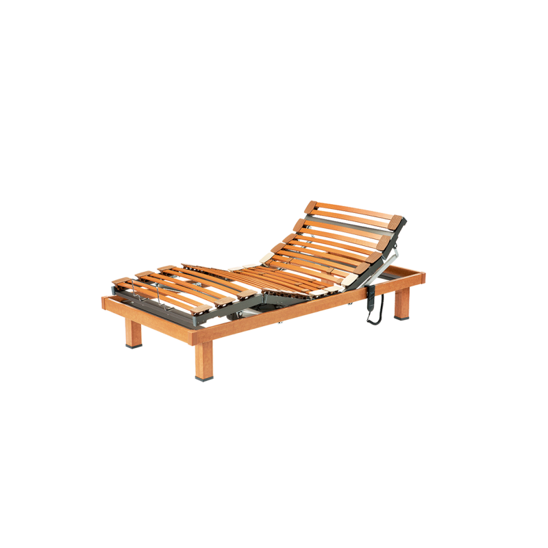 As lâminas da madeira de eucalipto estão juntas em grupos de dois com 12 tensores na zona lombar para regulação da firmeza. Cada lâmina está fixada à estrutura com suportes flexíveis de borracha que permitem uma completa adaptabilidade ao corpo.